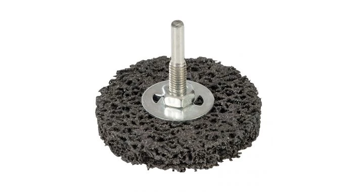 Roue abrasive en nylon non tissé à revêtement de carbure de silicium et tige en alliage. Pour éliminer rouille et peinture, détartrer, ébavurer et pour la préparation au soudage. Pour le travail du métal et de la pierre, le nettoyage et la préparation des surfaces. Tige de 6,35 mm. Destinée à être montée sur une perceuse.